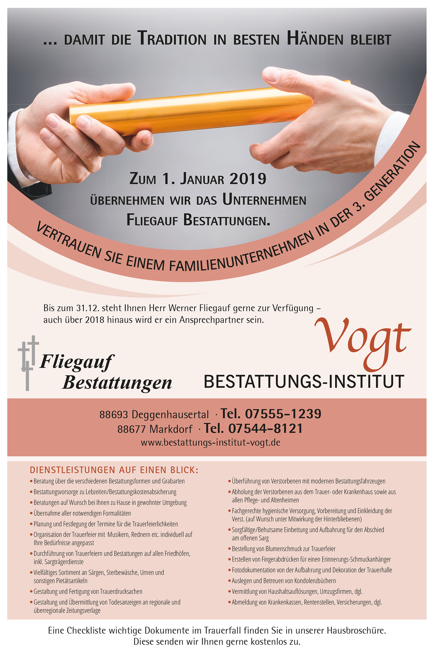Am 1. Januar 2019 habe ich dann mein Bestattungsunternehmen in der dritten Generation an die Firma Bestattungs-Institut Vogt, mit der wir bereits seit vielen Jahren ein gutes und kollegiales Verhältnis pflegten, übergeben und bin in den Ruhestand gegangen.